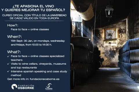 5 de agosto de 2025, El Puerto de Santa María. La Facultad de Ciencias Sociales y de la Comunicación junto con la Fundación Osborne han desarrollado un programa de estudios para formar a los profesionales del sector del enoturismo y turismo activo vinculado al marco del Jerez. Esta nueva titulación microcredencial tiene un valor de 14,5 CTS que equivalen a un periodo de formación de 362 horas divididas en clases presenciales, se impartirán en la sede de Fundación Osborne en El Puerto, también tendrá un importante capítulo de visitas de estudios por diferentes viñas, bodegas, archivos, instituciones del sector, restaurantes y otros lugares de interés. Además, se impartirán clases online sincrónicas y asincrónicas. Todo ello para formar a los futuros guías de bodegas o profesionales del vino relacionados con el turismo o relacionados con la atención al público en enotecas, restaurantes u otras posiciones que actualmente demanda el sector del vino.