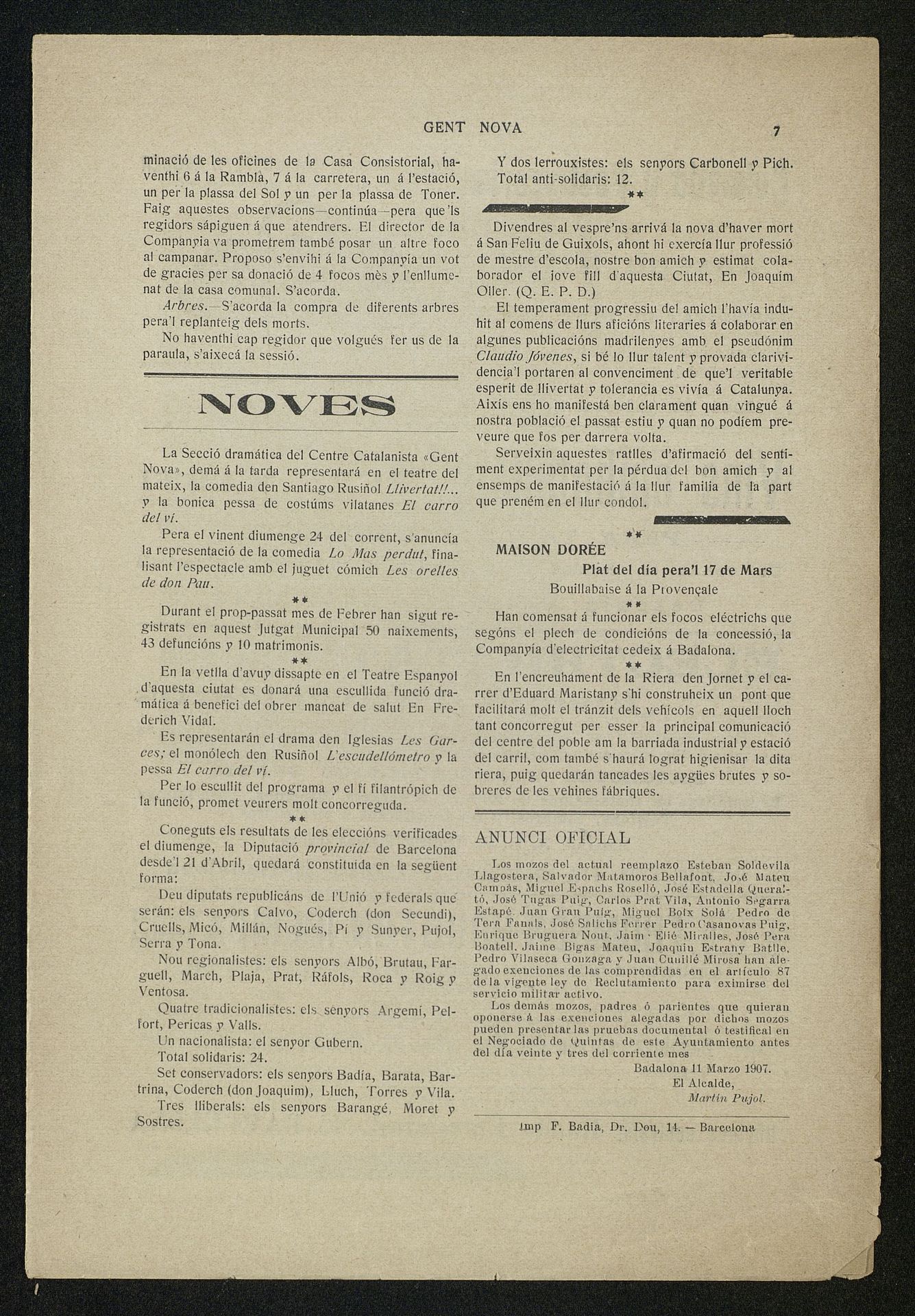 Publicación de la esquela de Don Vicente Bosch y Grau en Diario Gent Nova con semblanza en catalán