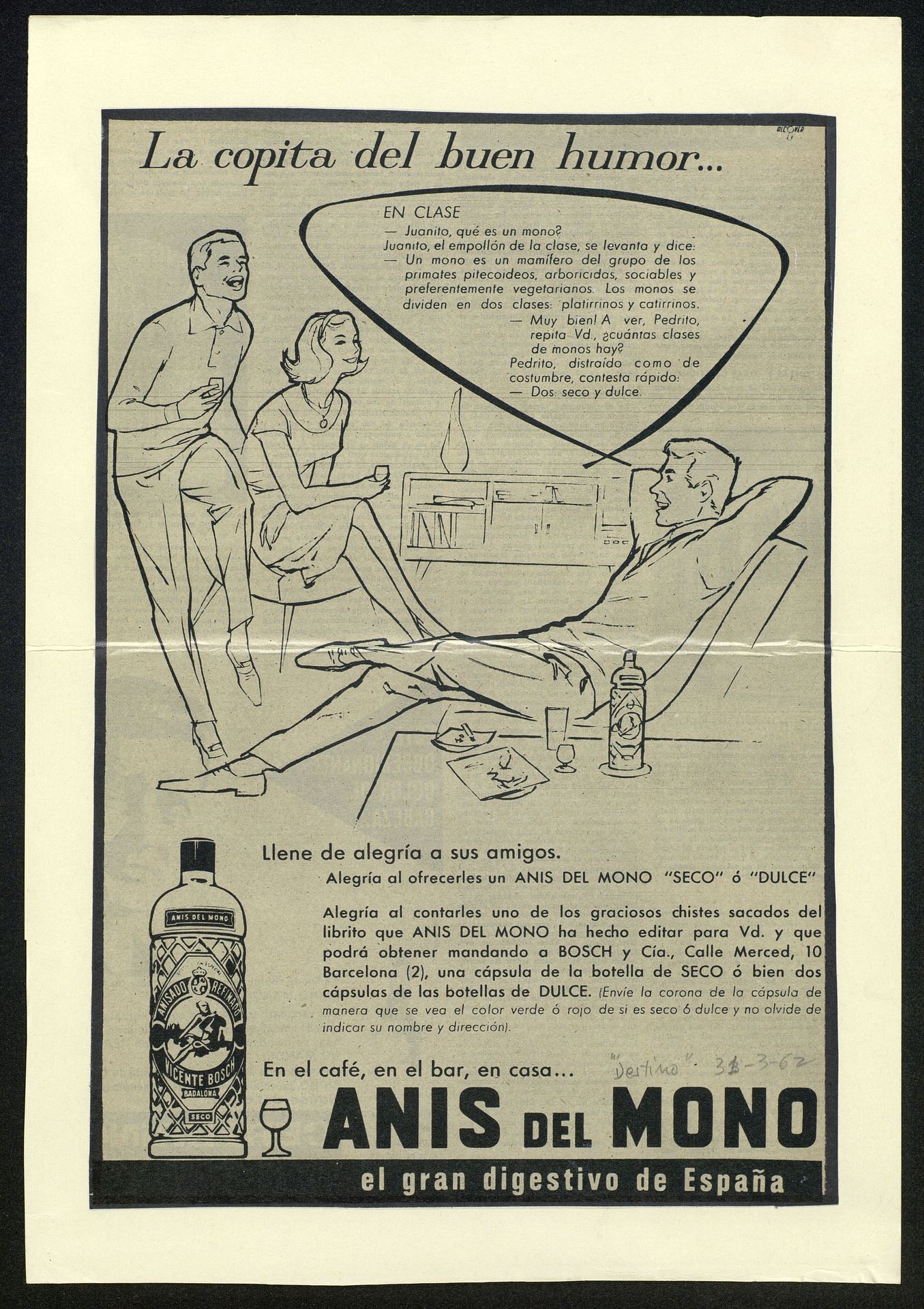La copita del buen humor... En clase Juanito, ¿Qué es un mono?... LLene de alegría a sus amigos. En el café, en el bar, en casa... Anís del Mono. El gran digestivo de España [Anuncio publicitario]