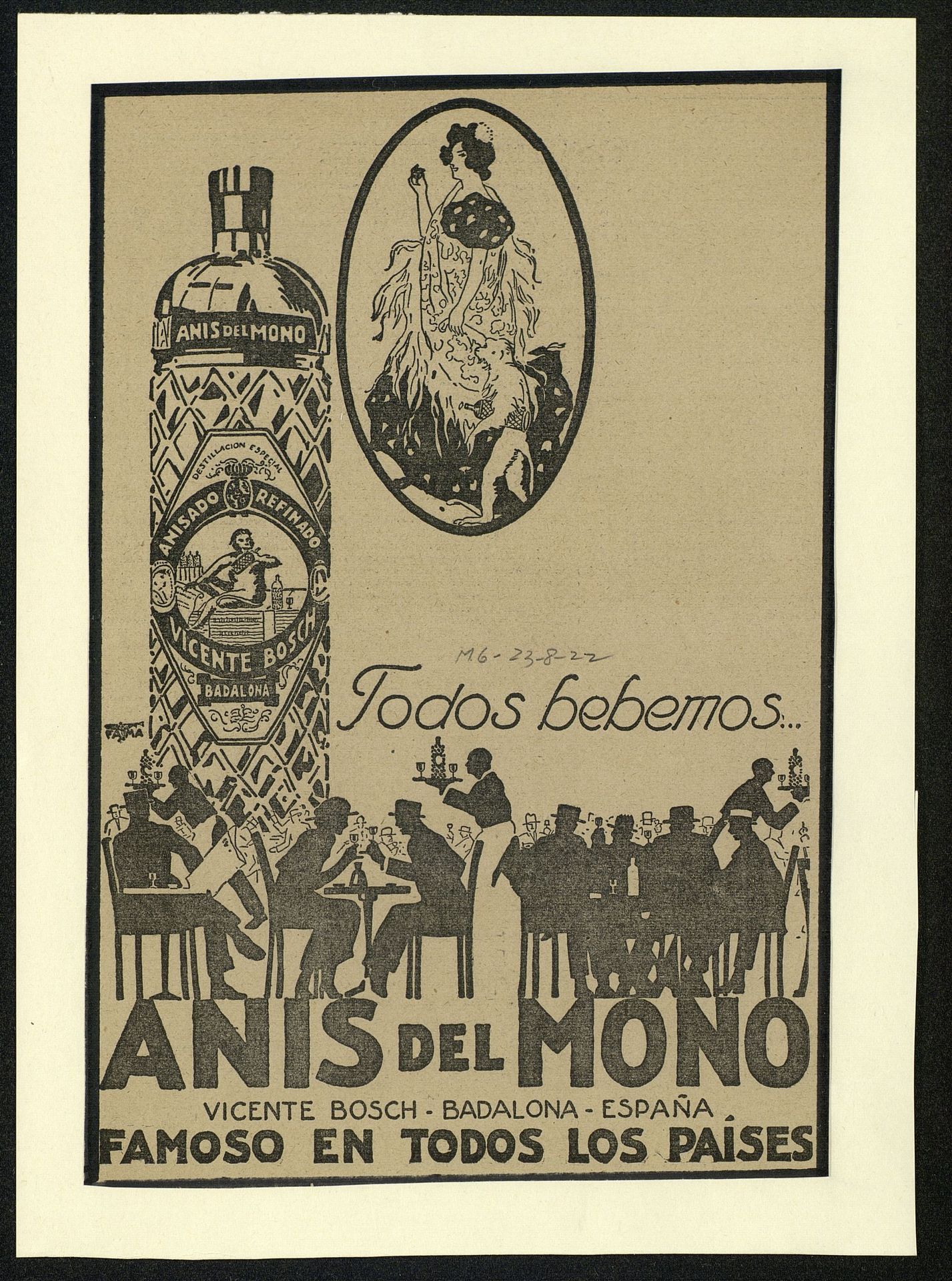 Todo bebemos... Anís del Mono. Vicente Bosch, Badalona (Barcelona, España) Famoso en todos los países [Anuncio publicitario]
